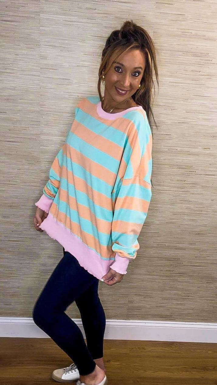 Elevate your wardrobe with our Stripe Terry Top! In vibrant aqua and coral stripes, this oversized top is perfect for a casual day out. The lettuce edge style adds a touch of playful charm. Stand out in style and comfort with this must-have addition!