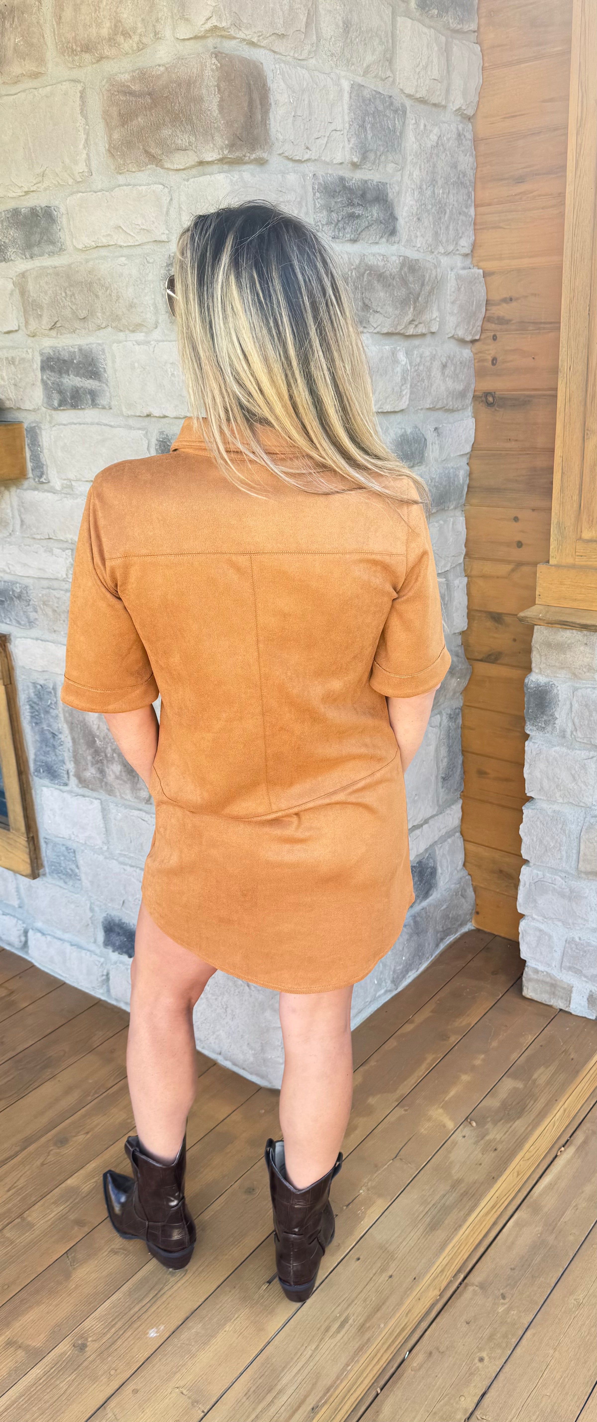 The Harvest Moon Dress is your new fall favorite. Made from ultra-soft faux suede in a rich tobacco shade, this piece blends cozy comfort with effortless style. It features short sleeves, a flattering drop waist, and a rounded hem for an easy, feminine silhouette. The button-front detail adds a hint of charm while making it super easy to slip on and go.