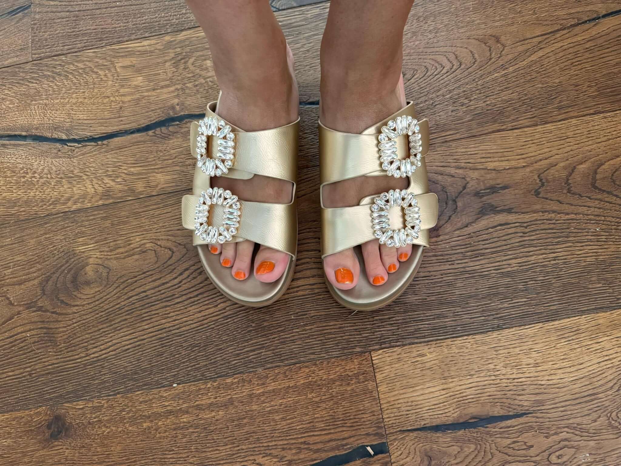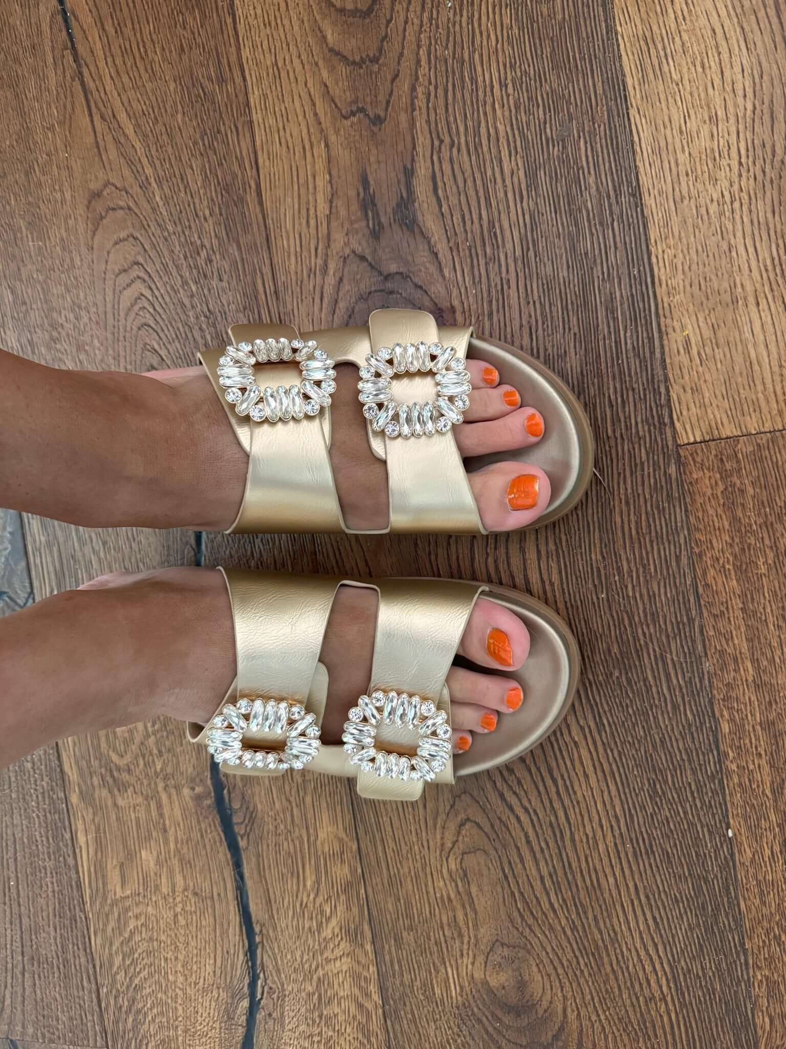 Elevate your style with The Goldie’s, adorned with dazzling crystals. Perfect for any occasion, these luxurious sandals radiate elegance and sophistication. Trust in their exquisite craftsmanship, made with the highest quality materials. Elevate your look and make a statement with The Goldie’s.