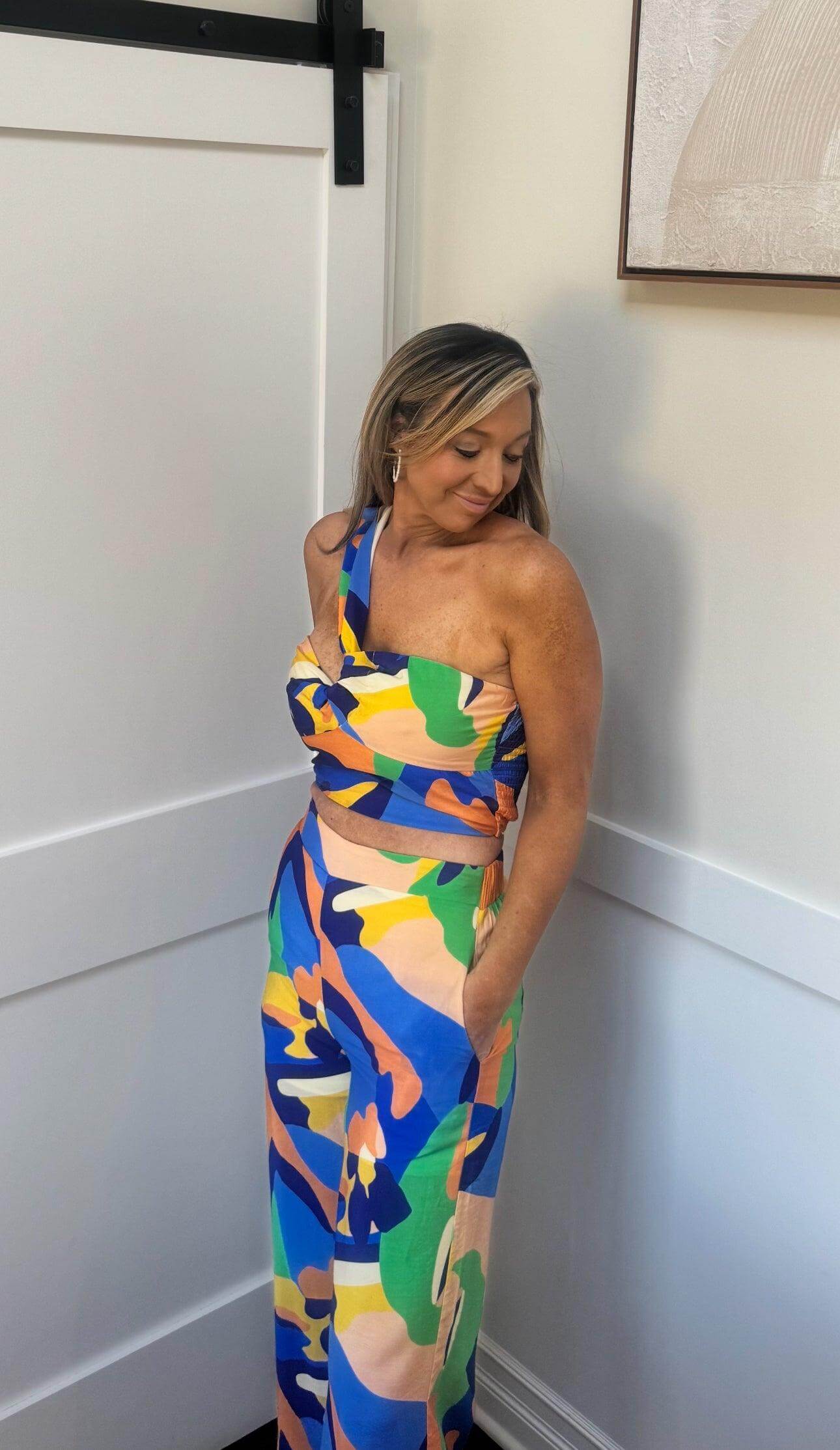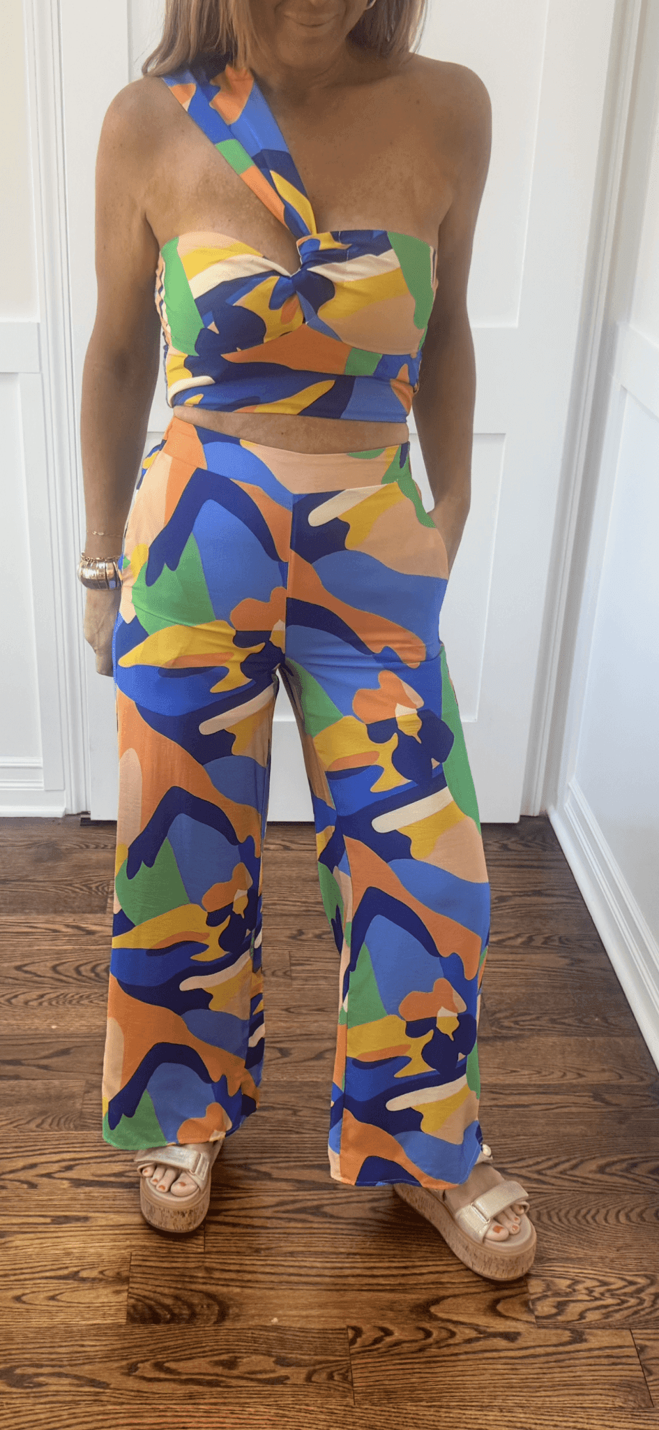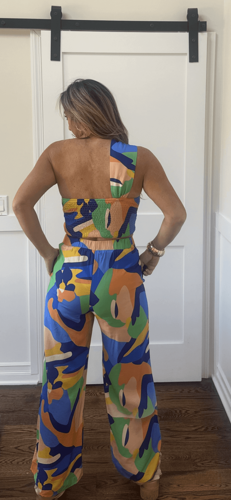 This tropical pant set boasts a vibrant multi-color design and a chic one-shoulder top. Made from high-quality materials, it offers both style and comfort. Perfect for a day at the beach or a night on the town, this set will make you stand out in any setting.