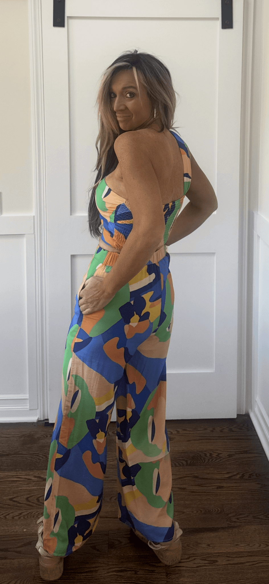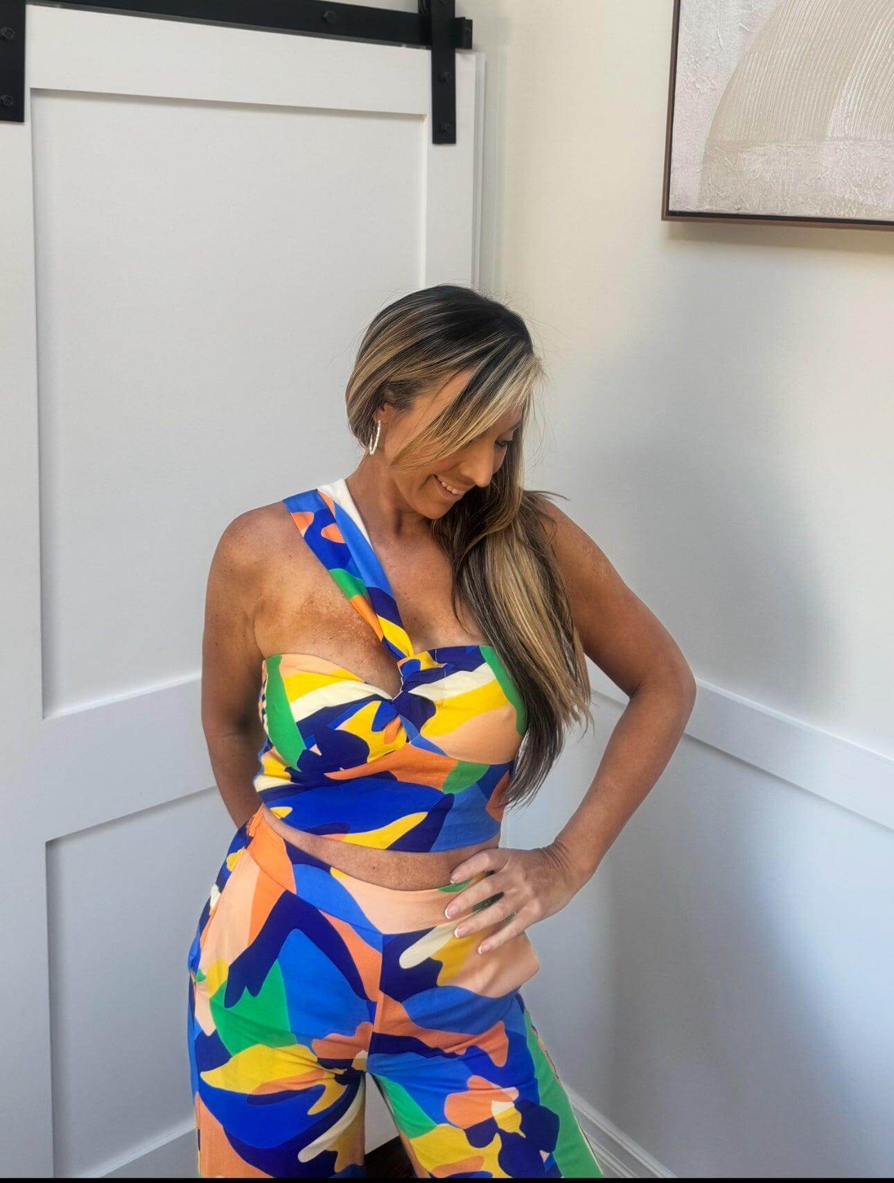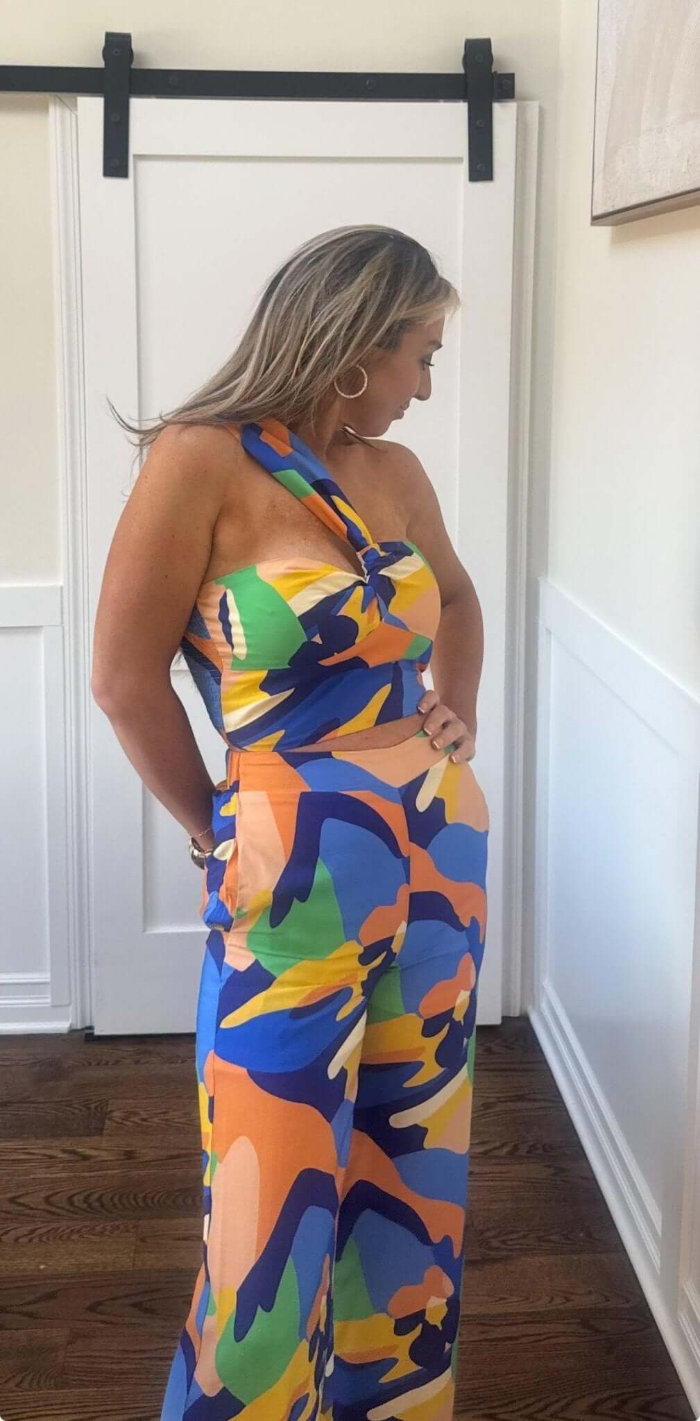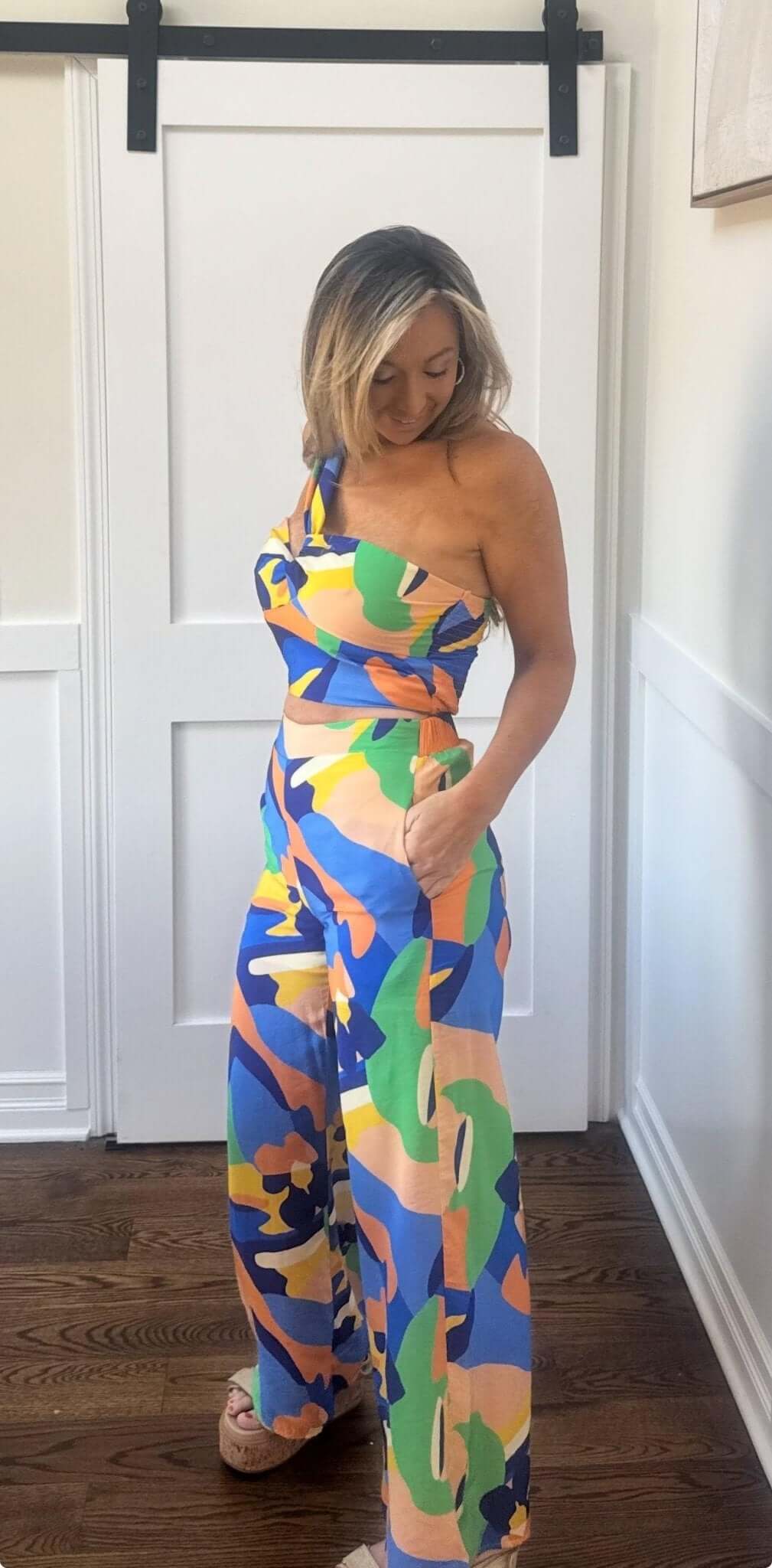 This tropical pant set boasts a vibrant multi-color design and a chic one-shoulder top. Made from high-quality materials, it offers both style and comfort. Perfect for a day at the beach or a night on the town, this set will make you stand out in any setting.